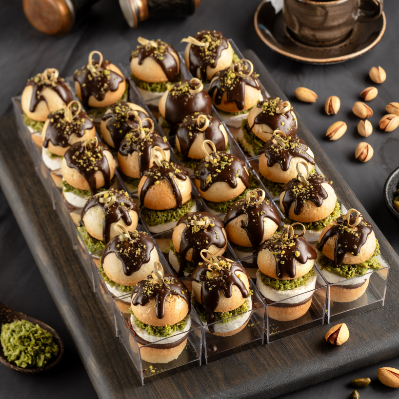 Десерт для истинных гурманов в духе роскоши Дубая! Бисквитные мини-булочки, хрустящая прослойка из теста катаифи с фисташками и кунжутной пастой, а также нежное суфле и шоколадная глазурь не оставят Вас равнодушными.