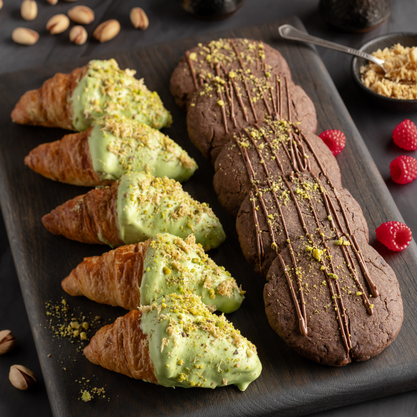 Трендовый набор для бранча или кофе-брейка в дубайском стиле! Шоколадные кукисы с хрустящей фисташковой начинкой и воздушные круассаны с фисташковой глазурью.