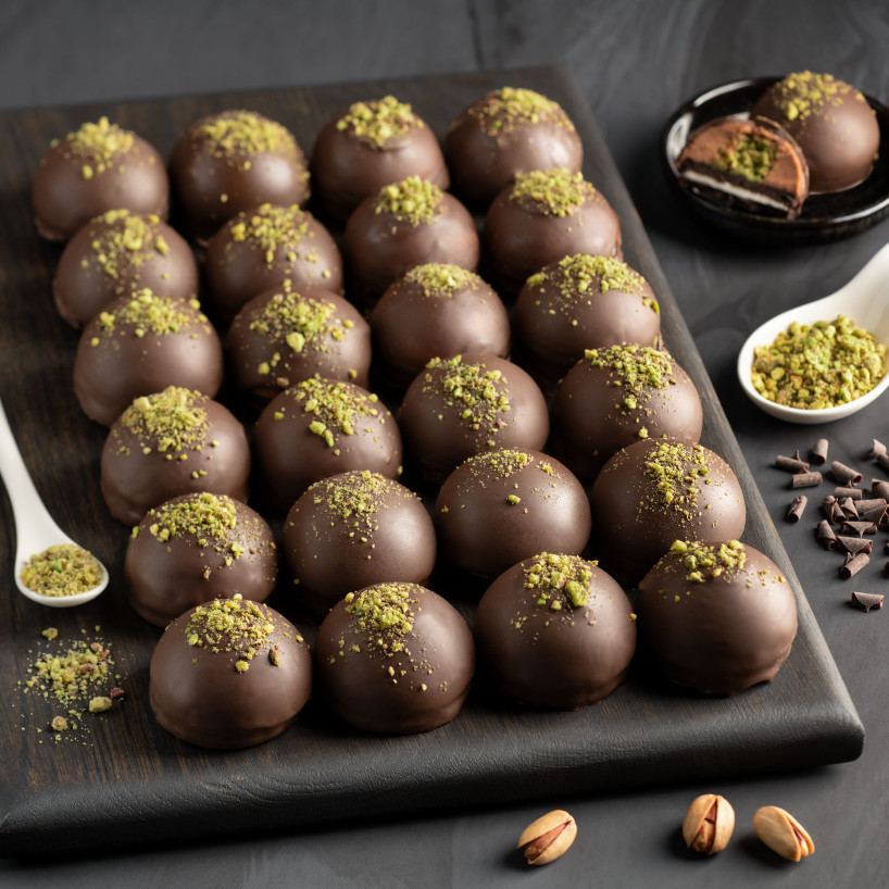 Бархатный шоколадный мусс, хрустящая сердцевина из теста катаифи и фисташковой пасты и основа из шоколадно-молочного печенья, обрамленные в нежную молочную глазурь.