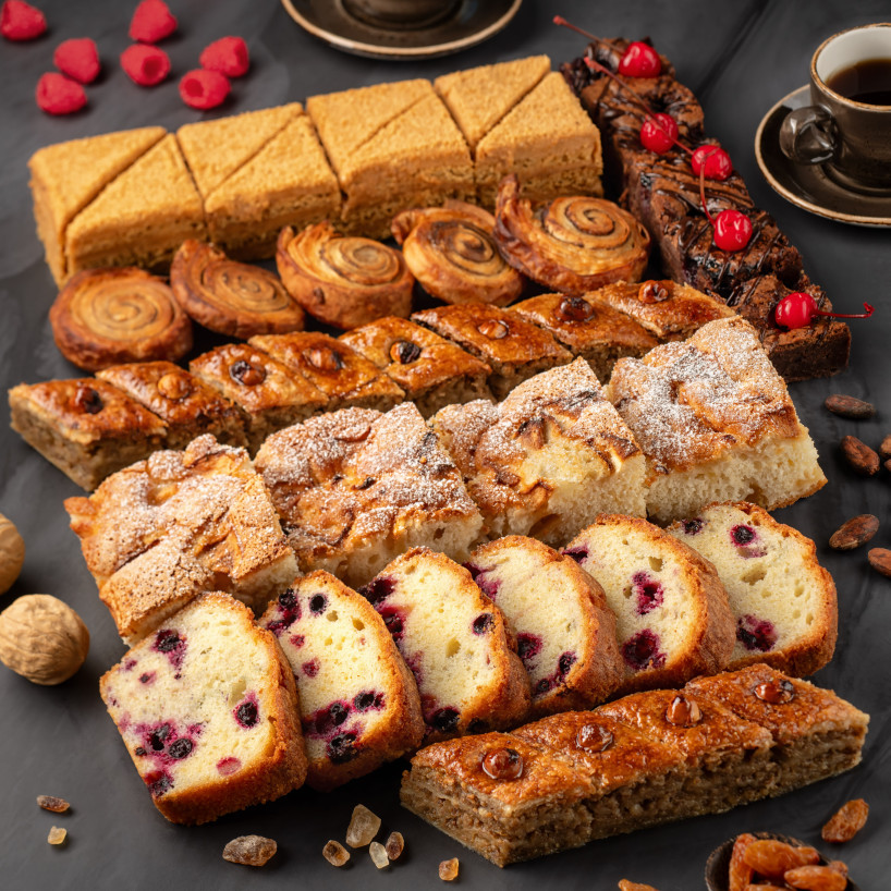 Ароматные хиты в одном ассорти: домашний смородиновый кекс, нежная и воздушная яблочная шарлотка, сладкая и сочная пахлава, ароматные улитки с корицей, восхитительный медовик и насыщенный шоколадный брауни с вишней.